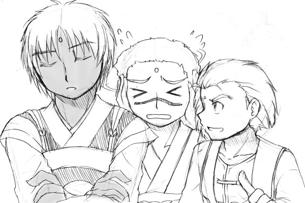 左から幽幻、星火。福寿。紅蓮の祠からの岐路、その最中の小太郎戦反省会兼・次に向けての作戦会議。